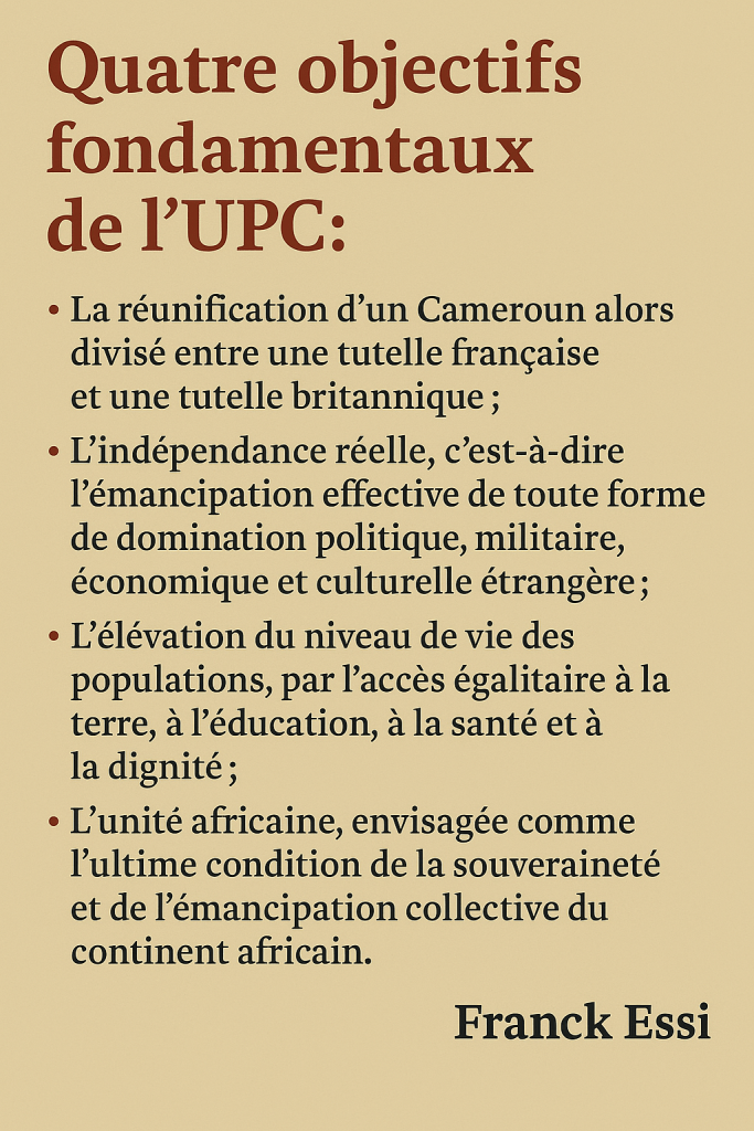 En fondant l’UPC, ils ne créaient pas seulement un parti politique : ils donnaient naissance à un mouvement profondément ancré dans les aspirations populaires, structuré autour de quatre objectifs fondamentaux :