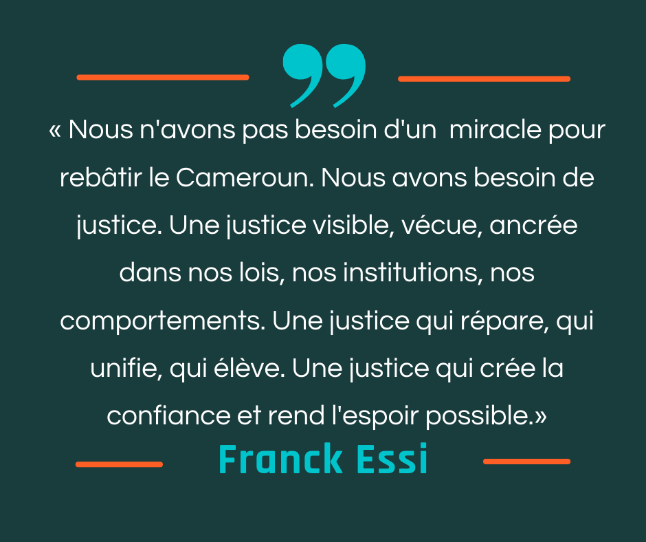 Nous n’avons pas besoin d’un miracle pour rebâtir le Cameroun. Nous avons besoin de justice. Une justice visible, vécue, ancrée dans nos lois, nos institutions, nos comportements. Une justice qui répare, qui unifie, qui élève. Une justice qui crée la confiance et rend l’espoir possible.