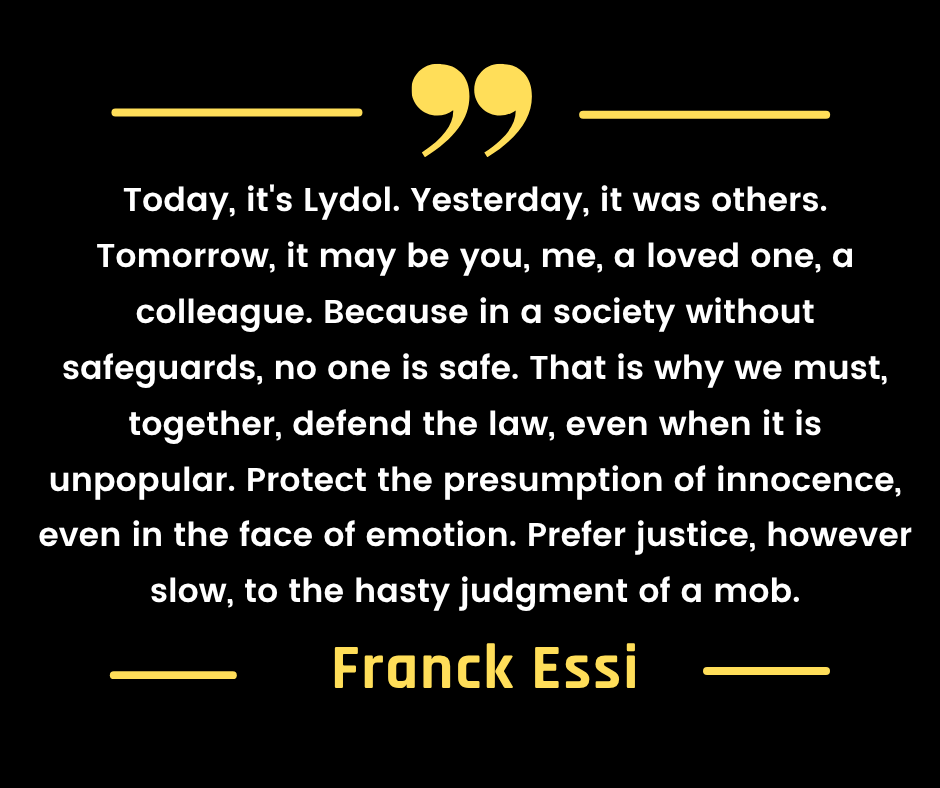 Today, it’s Lydol. Yesterday, it was others. Tomorrow, it may be you, me, a loved one, a colleague. Because in a society without safeguards, no one is safe. That is why we must, together, defend the law, even when it is unpopular. Protect the presumption of innocence, even in the face of emotion. Prefer justice, however slow, to the hasty judgment of a mob.