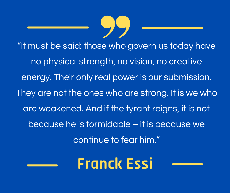It must be said: those who govern us today have no physical strength, no vision, no creative energy. Their only real power is our submission. They are not the ones who are strong. It is we who are weakened. And if the tyrant reigns, it is not because he is formidable – it is because we continue to fear him.