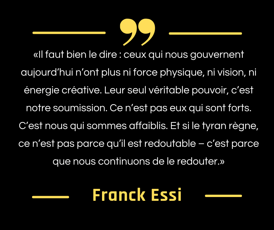 Il faut bien le dire : ceux qui nous gouvernent aujourd’hui n’ont plus ni force physique, ni vision, ni énergie créative. Leur seul véritable pouvoir, c’est notre soumission. Ce n’est pas eux qui sont forts. C’est nous qui sommes affaiblis. Et si le tyran règne, ce n’est pas parce qu’il est redoutable – c’est parce que nous continuons de le redouter.