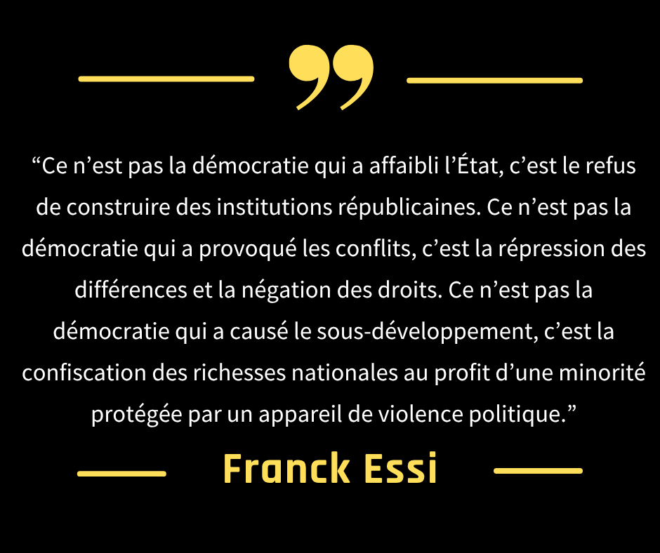 Ce n’est pas la démocratie qui a affaibli l’État, c’est le refus de construire des institutions républicaines. Ce n’est pas la démocratie qui a provoqué les conflits, c’est la répression des différences et la négation des droits. Ce n’est pas la démocratie qui a causé le sous-développement, c’est la confiscation des richesses nationales au profit d’une minorité protégée par un appareil de violence politique.