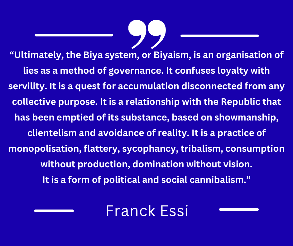 Ultimately, the Biya system, or Biyaism, is an organisation of lies as a method of governance. It confuses loyalty with servility. It is a quest for accumulation disconnected from any collective purpose. It is a relationship with the Republic that has been emptied of its substance, based on showmanship, clientelism and avoidance of reality. It is a practice of monopolisation, flattery, sycophancy, tribalism, consumption without production, domination without vision.