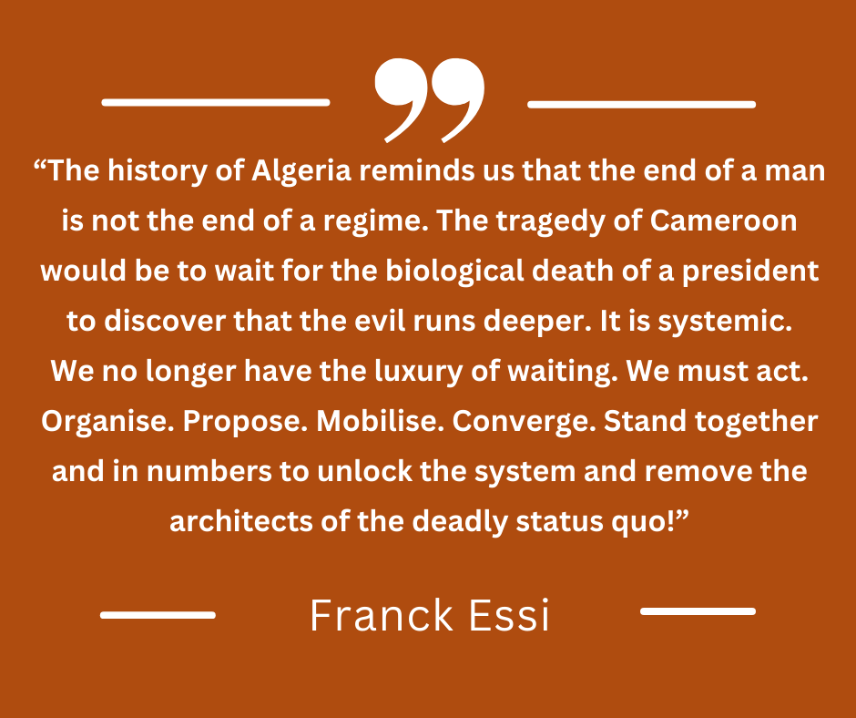 The history of Algeria reminds us that the end of a man is not the end of a regime. The tragedy of Cameroon would be to wait for the biological death of a president to discover that the evil runs deeper. It is systemic.