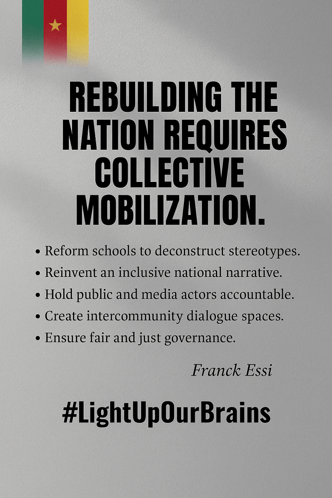 - Reform the education system: Introduce civic education rooted in pluralism, the history of Cameroon’s peoples, shared struggles, and national figures of unity. Make schools a place of deconstruction, not reproduction.