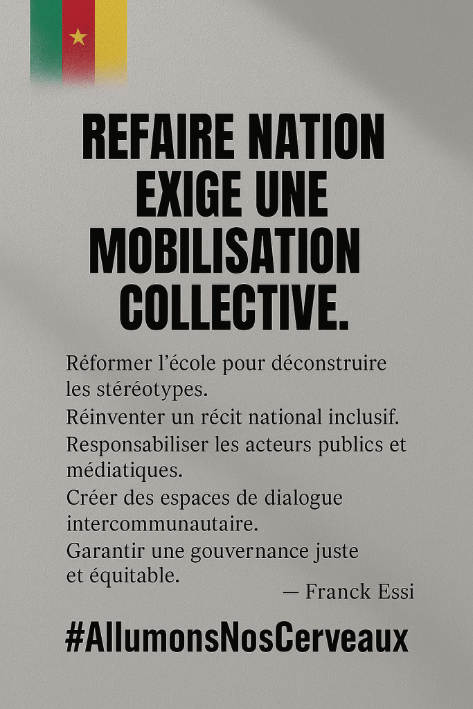 - Réformer les institutions éducatives : Introduire une éducation civique sincère, axée sur la pluralité, l’histoire des peuples du Cameroun, les luttes communes, les figures d’unité. Faire de l’école un espace de déconstruction des stéréotypes, pas de reproduction.