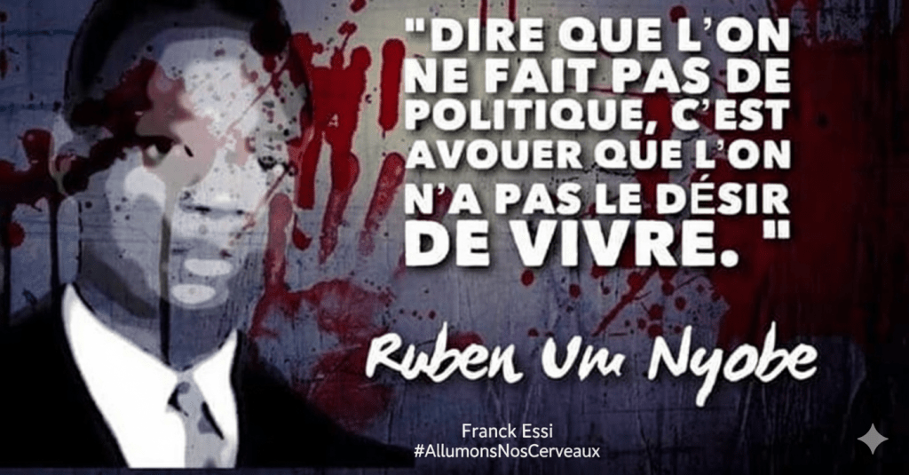 « Nous avons insisté auprès de nos compatriotes, auxquels l’on prodigue des conseils pour les mettre en garde contre la politique – cette « dangereuse entreprise » et nos compatriotes surtout les intellectuels, de dire qu’ils ne s’occupent pas de politique, parce qu’ils préparent on ne sait quelle situation matérielle – Nous avons donc insisté auprès d’eux pour leur montrer la tromperie que consistait une telle campagne. Tout est politique et tout s’encadre dans la politique. La religion est devenue politique. Le commerce est politique. Même le sport est politique. La politique touche à tout et tout touche à la politique. Dire que l’on ne fait pas de politique, c’est avouer que l’on n’a pas le désir de vivre. C’est pourquoi nous estimons qu’il faut, avant tout, se battre pour les libertés fondamentales gage essentiel du succès matériel. » Ruben Um Nyobe, extrait du « Rapport présenté au 2ème Congrès statutaire de l’UPC », Eséka, 29 septembre 1952.