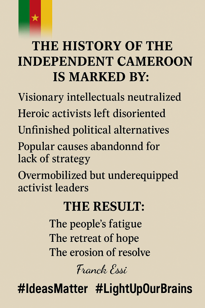 Recent Cameroonian history is filled with brilliant intellectuals neutralized for lack of strategy, heroic activists disoriented for lack of vision, aborted political alternatives, and exhausted citizen movements. The result: public demobilization, blocked reforms, and creeping resignation.