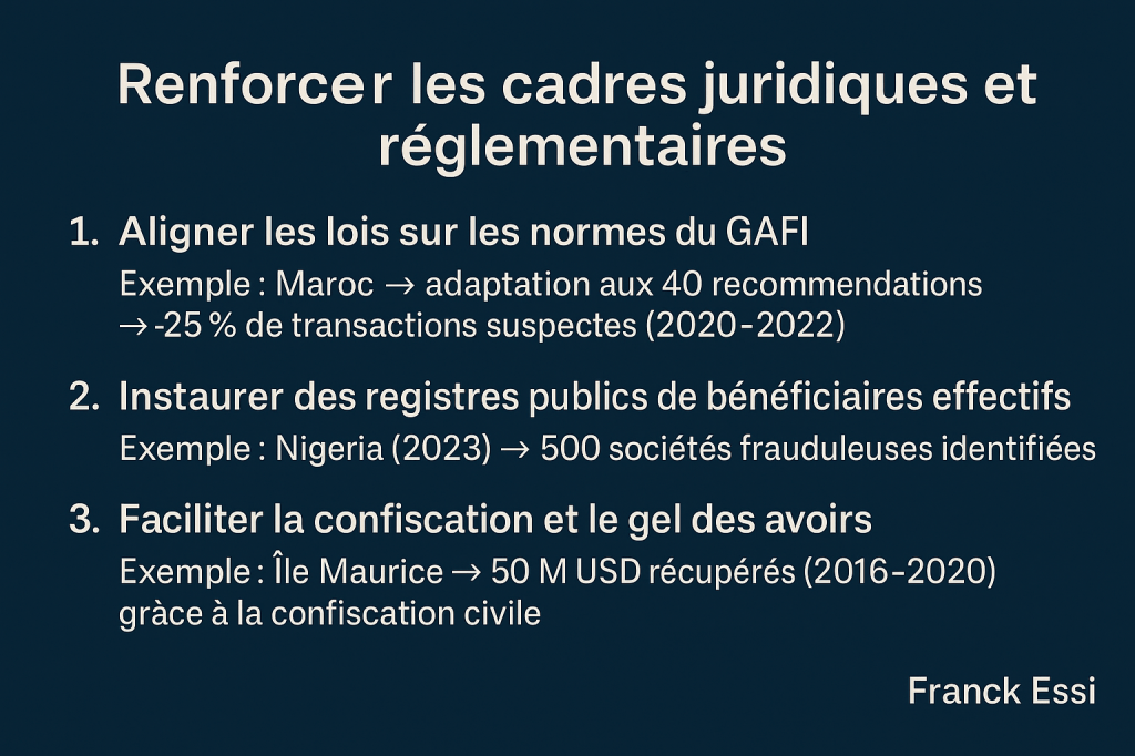 - Faciliter la confiscation et le gel des avoirs, y compris par des procédures civiles. L’Île Maurice, grâce à la confiscation civile, a récupéré près de 50 millions USD entre 2016 et 2020⁴.