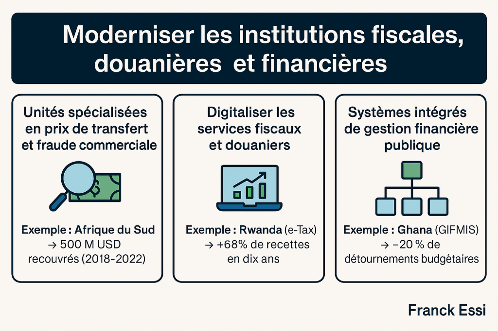 - Digitaliser les services fiscaux et douaniers. Le Rwanda, avec son système e-Tax, a accru ses recettes fiscales de 68 % en dix ans⁶.