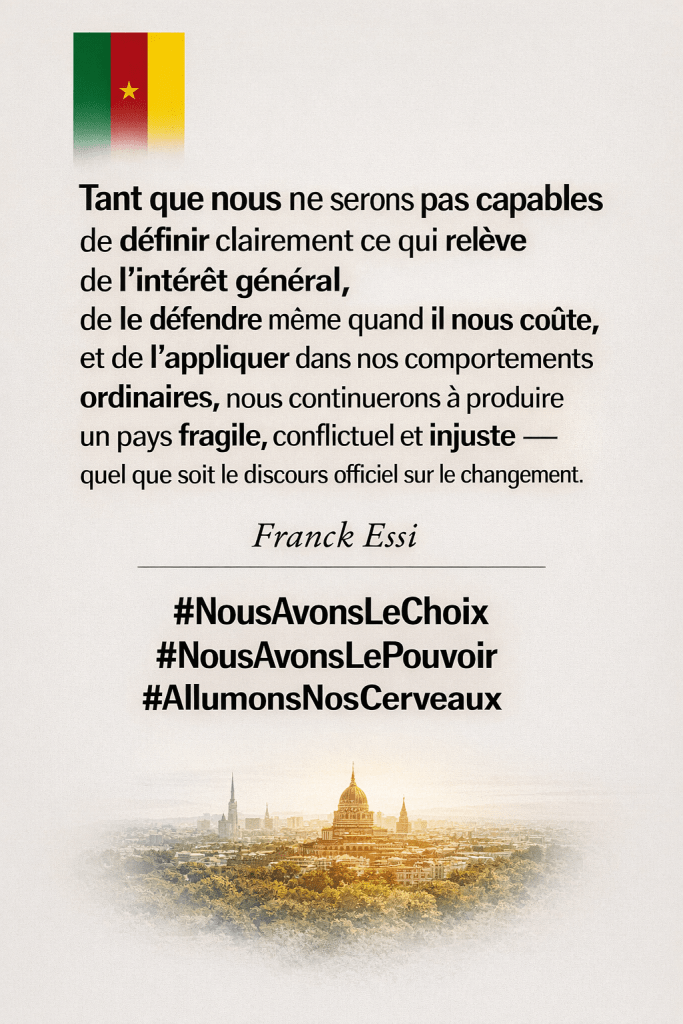 Tant que nous ne serons pas capables de définir clairement ce qui relève de l’intérêt général, de le défendre même lorsqu’il nous coûte, et de l’appliquer dans nos comportements ordinaires, nous continuerons à produire un pays fragile, conflictuel et injuste — quels que soient les discours officiels sur le changement.