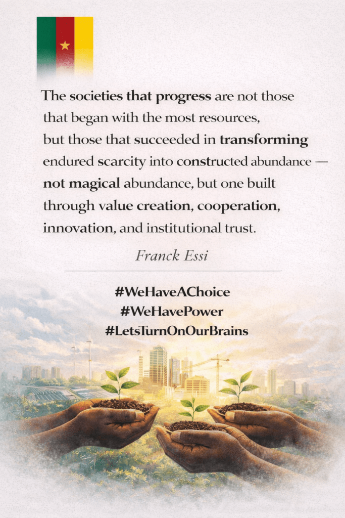 The societies that progress are not those that began with the most resources, but those that succeeded in transforming endured scarcity into constructed abundance — not magical abundance, but one built through value creation, cooperation, innovation, and institutional trust.