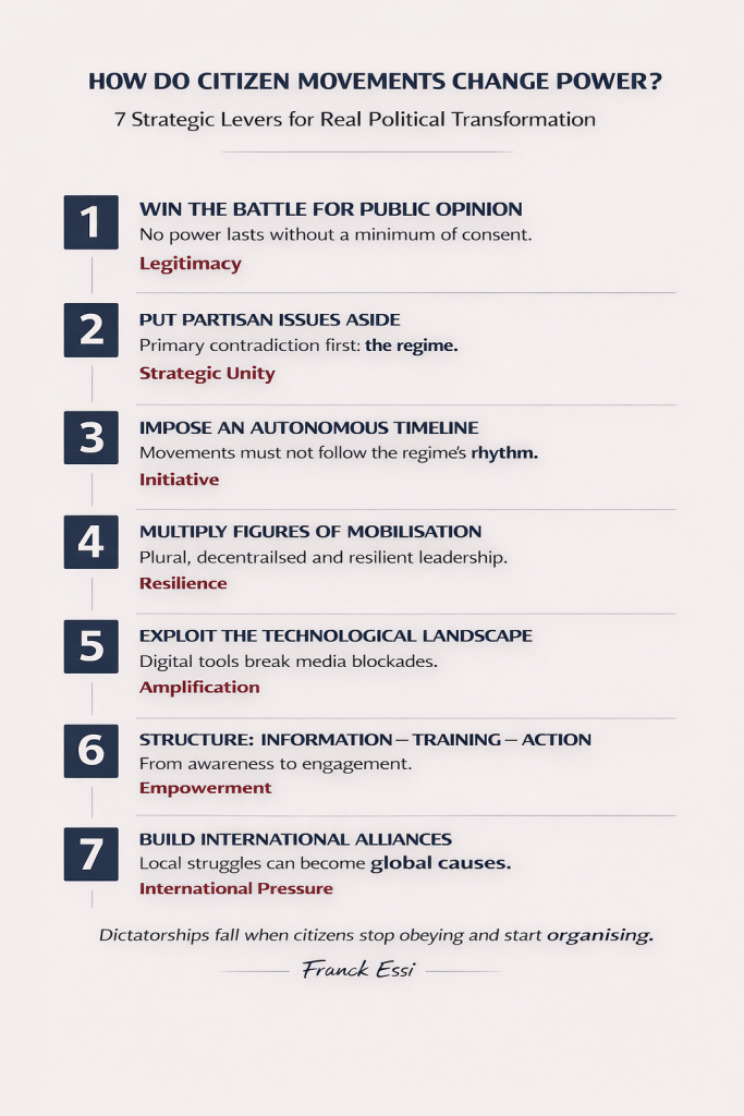 For a citizen movement to succeed in overthrowing a dictatorship in a context such as that of Cameroon, certain favourable factors must be in place. These include: