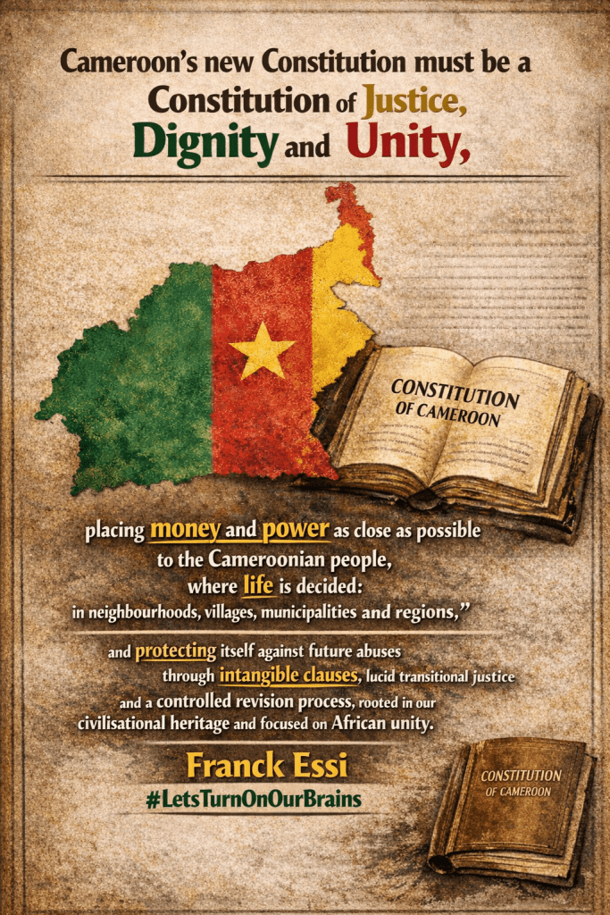 Cameroon’s new Constitution must be a Constitution of Justice, Dignity and Unity, placing money and power as close as possible to the Cameroonian people, where life is decided: in neighbourhoods, villages, municipalities and regions, and protecting itself against future abuses through intangible clauses, lucid transitional justice and a controlled revision process, rooted in our civilisational heritage and focused on African unity.