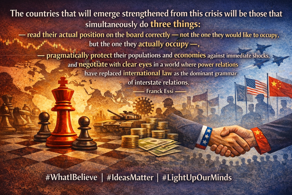 The countries that will emerge strengthened from this crisis will be those that simultaneously do three things: read their actual position on the board correctly — not the one they would like to occupy, but the one they actually occupy —, pragmatically protect their populations and economies against immediate shocks, and negotiate with clear eyes in a world where power relations have replaced international law as the dominant grammar of interstate relations.