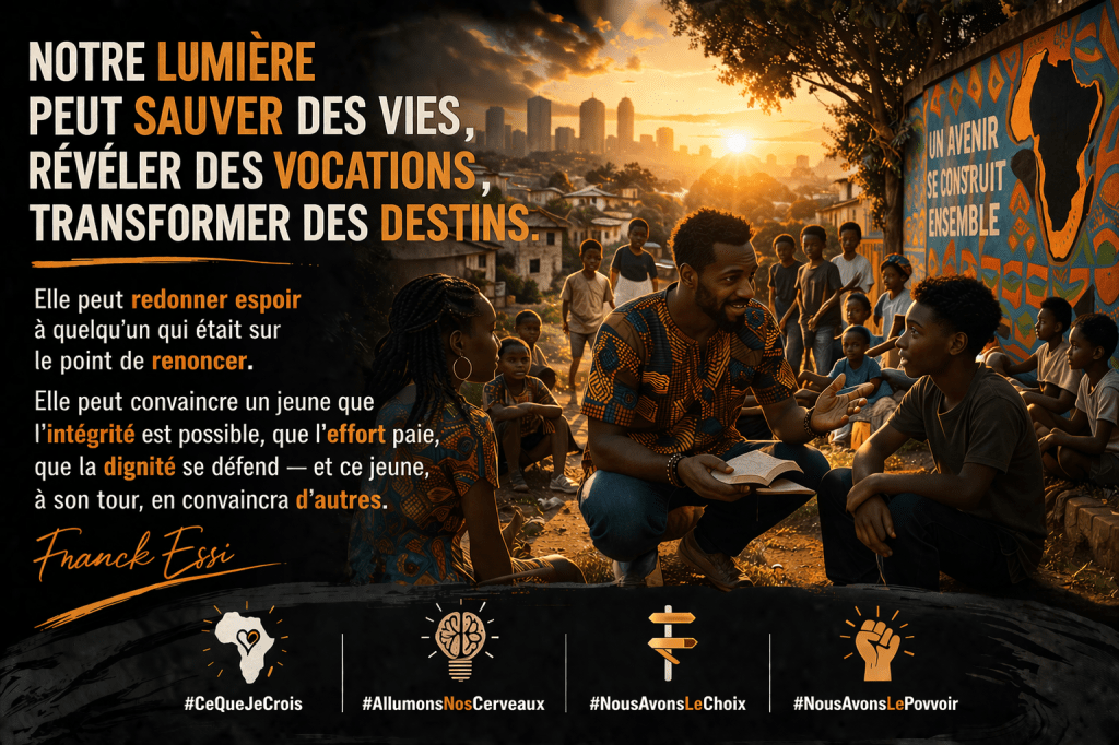 Notre lumière peut sauver des vies, révéler des vocations, transformer des destins. Elle peut redonner espoir à quelqu’un qui était sur le point de renoncer. Elle peut convaincre un jeune que l’intégrité est possible, que l’effort paie, que la dignité se défend — et ce jeune, à son tour, en convaincra d’autres.
